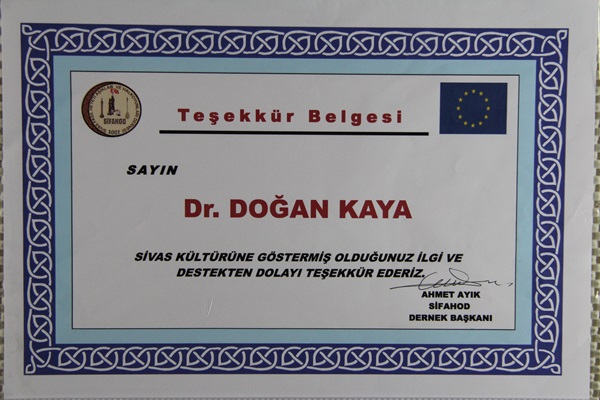 Sifahod Tarafından Teşekkür Belgesi