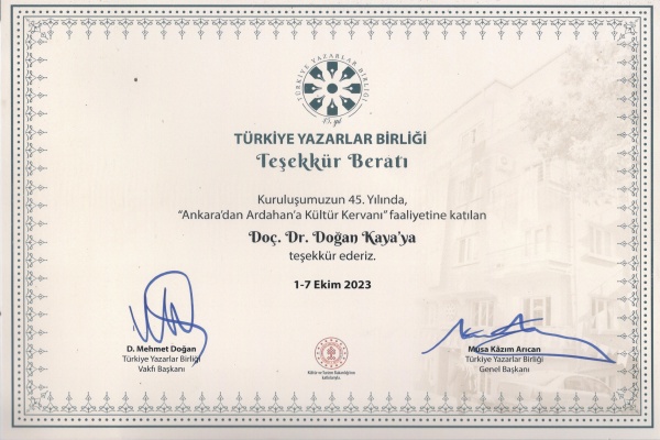 Türkiye Yazarlar Birliği Teşekkür Beratı
